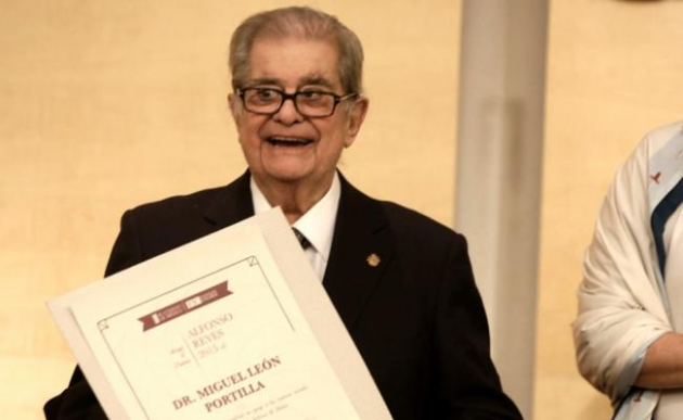 Por su obra como filósofo, historiador, filólogo y traductor, por su labor internacionalmente reconocida en la preservación de las lenguas indígenas, muy especialmente del náhuatl, y a través de ellas, de la filosofía de las lenguas y culturas originarias, Miguel León Portilla recibió hoy el premio Alfonso Reyes 2015 que le otorgó el Colegio de México (Colmex).